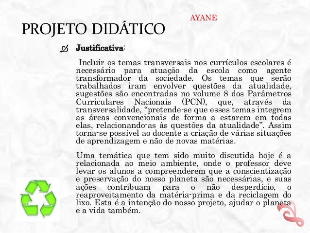 AYANEPROJETO DIDÁTICO     Justificativa:        Incluir os temas transversais nos currículos escolares é       necessário...