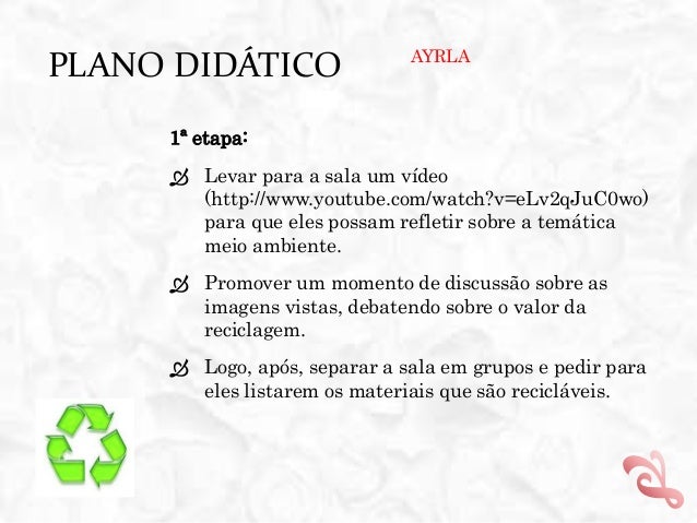 5. 5. AYRLAPLANO DIDÁTICO 1ª etapa:  Levar para a sala um vídeo (http://www.youtube.com/watch?v=eLv2qJuC0wo) para que eles possam refletir sobre a temática meio ambiente.  Promover um momento de discussão sobre as imagens vistas, debatendo sobre o valor da reciclagem.  Logo, após, separar a sala em grupos e pedir para eles listarem os materiais que são recicláveis.