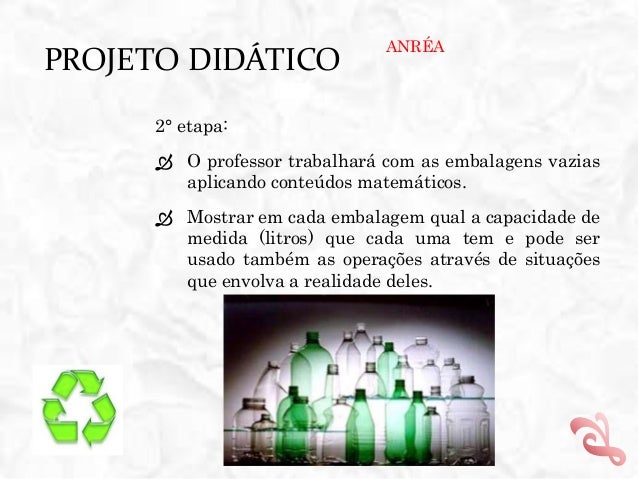 7. 7. ANRÉAPROJETO DIDÁTICO 2° etapa:  O professor trabalhará com as embalagens vazias aplicando conteúdos matemáticos.  Mostrar em cada embalagem qual a capacidade de medida (litros) que cada uma tem e pode ser usado também as operações através de situações que envolva a realidade deles.