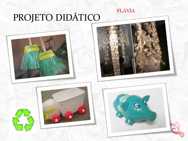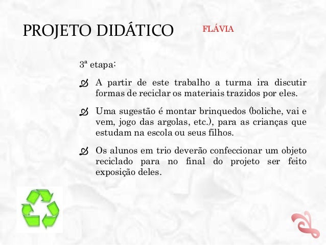 8. 8. PROJETO DIDÁTICO FLÁVIA 3ª etapa:  A partir de este trabalho a turma ira discutir formas de reciclar os materiais trazidos por eles.  Uma sugestão é montar brinquedos (boliche, vai e vem, jogo das argolas, etc.), para as crianças que estudam na escola ou seus filhos.  Os alunos em trio deverão confeccionar um objeto reciclado para no final do projeto ser feito exposição deles.