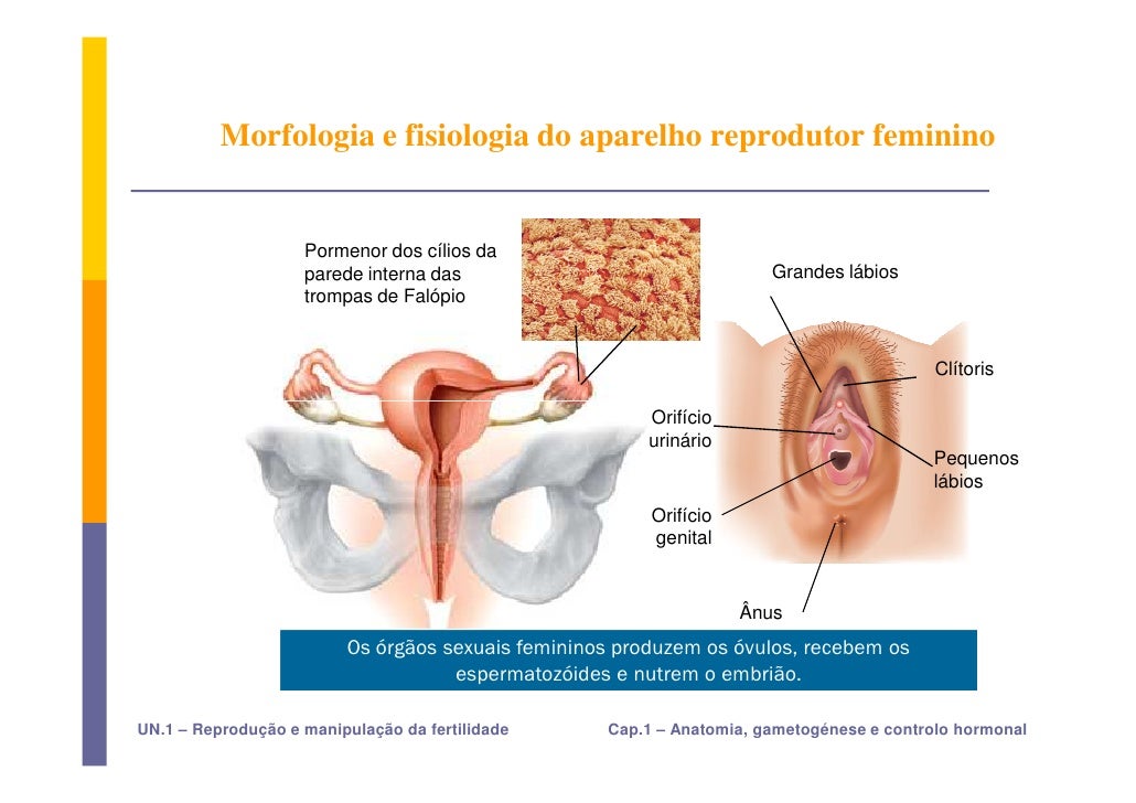 17. 17. Morfologia e fisiologia do aparelho reprodutor feminino Pormenor dos cílios da parede interna das Grandes lábios trompas de Falópio Clítoris Orifício urinário Pequenos lábios Orifício genital Ânus Os órgãos sexuais femininos produzem os óvulos, recebem os espermatozóides e nutrem o embrião. UN.1 – Reprodução e manipulação da fertilidade Cap.1 – Anatomia, gametogénese e controlo hormonal