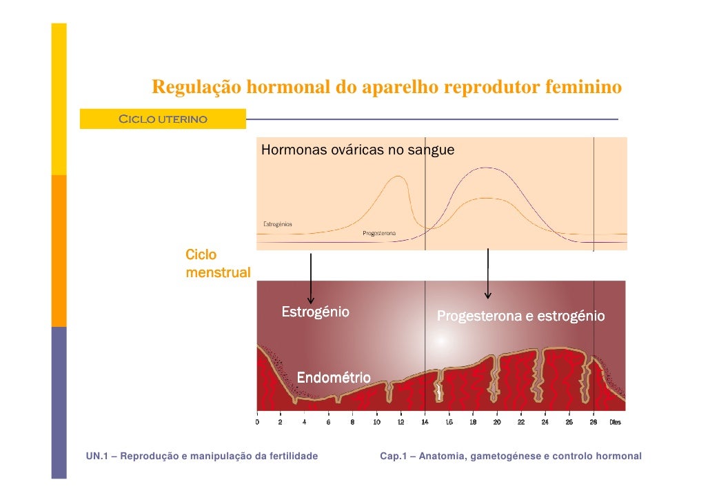 32. 32. Regulação hormonal do aparelho reprodutor feminino Ciclo uterino Hormonas ováricas no sangue Ciclo menstrual Estrogénio Progesterona e estrogénio Endométrio UN.1 – Reprodução e manipulação da fertilidade Cap.1 – Anatomia, gametogénese e controlo hormonal