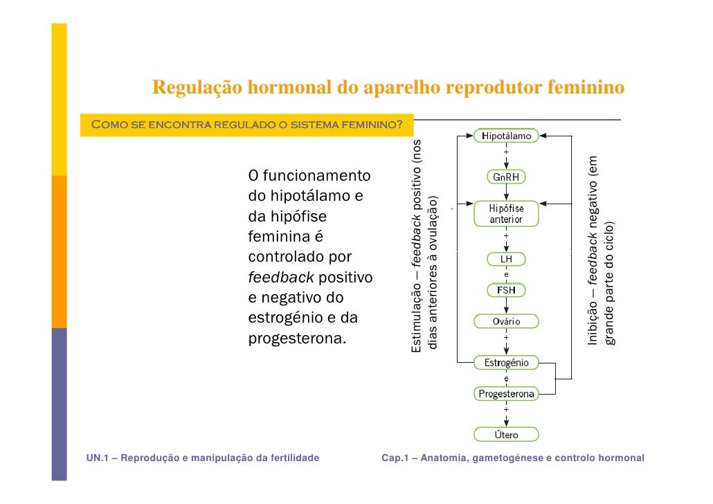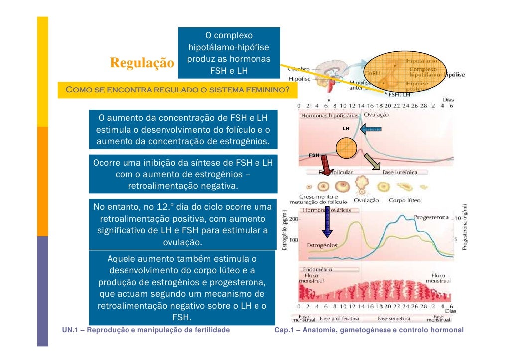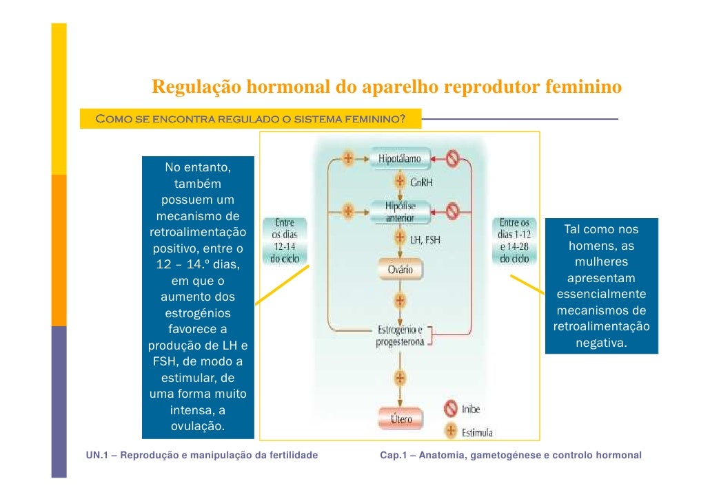 35. 35. Regulação hormonal do aparelho reprodutor feminino Como se encontra regulado o sistema feminino? Estimulação — feedback positivo (nos Inibição — feedback negativo (em O funcionamento do hipotálamo e dias anteriores à ovulação) da hipófise grande parte do ciclo) feminina é controlado por feedback positivo e negativo do estrogénio e da progesterona. UN.1 – Reprodução e manipulação da fertilidade Cap.1 – Anatomia, gametogénese e controlo hormonal