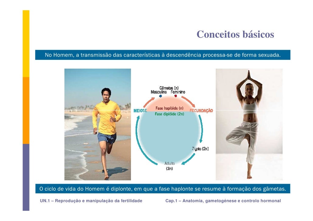 4. 4. Conceitos básicos No Homem, a transmissão das características à descendência processa-se de forma sexuada. O ciclo de vida do Homem é diplonte, em que a fase haplonte se resume à formação dos gâmetas. UN.1 – Reprodução e manipulação da fertilidade Cap.1 – Anatomia, gametogénese e controlo hormonal