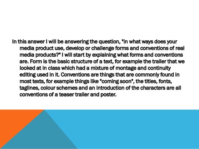 1. 1. In this answer I will be answering the question, "in what ways does your media product use, develop or challenge forms and conventions of real media products?" I will start by explaining what forms and conventions are. Form is the basic structure of a text, for example the trailer that we looked at in class which had a mixture of montage and continuity editing used in it. Conventions are things that are commonly found in most texts, for example things like "coming soon", the titles, fonts, taglines, colour schemes and an introduction of the characters are all conventions of a teaser trailer and poster.