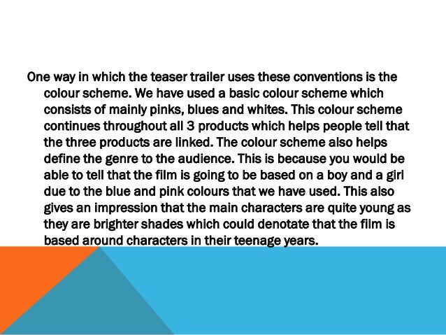 2. 2. One way in which the teaser trailer uses these conventions is the colour scheme. We have used a basic colour scheme which consists of mainly pinks, blues and whites. This colour scheme continues throughout all 3 products which helps people tell that the three products are linked. The colour scheme also helps define the genre to the audience. This is because you would be able to tell that the film is going to be based on a boy and a girl due to the blue and pink colours that we have used. This also gives an impression that the main characters are quite young as they are brighter shades which could denotate that the film is based around characters in their teenage years.