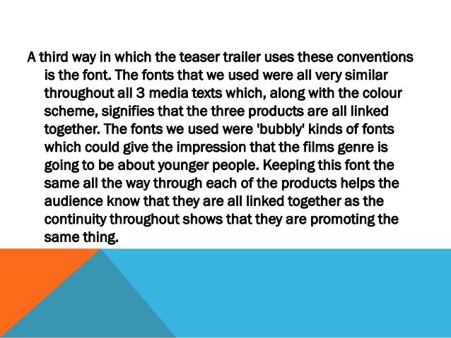 4. 4. A third way in which the teaser trailer uses these conventions is the font. The fonts that we used were all very similar throughout all 3 media texts which, along with the colour scheme, signifies that the three products are all linked together. The fonts we used were bubbly kinds of fonts which could give the impression that the films genre is going to be about younger people. Keeping this font the same all the way through each of the products helps the audience know that they are all linked together as the continuity throughout shows that they are promoting the same thing.