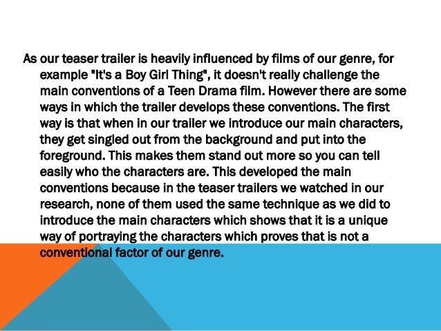 5. 5. As our teaser trailer is heavily influenced by films of our genre, for example "Its a Boy Girl Thing", it doesnt really challenge the main conventions of a Teen Drama film. However there are some ways in which the trailer develops these conventions. The first way is that when in our trailer we introduce our main characters, they get singled out from the background and put into the foreground. This makes them stand out more so you can tell easily who the characters are. This developed the main conventions because in the teaser trailers we watched in our research, none of them used the same technique as we did to introduce the main characters which shows that it is a unique way of portraying the characters which proves that is not a conventional factor of our genre.