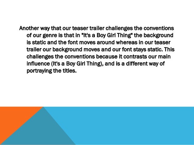 6. 6. Another way that our teaser trailer challenges the conventions of our genre is that in "Its a Boy Girl Thing" the background is static and the font moves around whereas in our teaser trailer our background moves and our font stays static. This challenges the conventions because it contrasts our main influence (Its a Boy Girl Thing), and is a different way of portraying the titles.