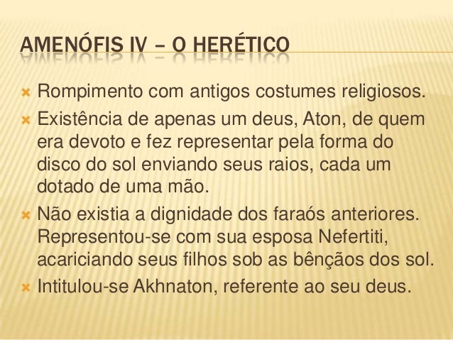 9. 9. AMENÓFIS IV – O HERÉTICO Rompimento com antigos costumes religiosos. Existência de apenas um deus, Aton, de quem era devoto e fez representar pela forma do disco do sol enviando seus raios, cada um dotado de uma mão. Não existia a dignidade dos faraós anteriores. Representou-se com sua esposa Nefertiti, acariciando seus filhos sob as bênçãos dos sol. Intitulou-se Akhnaton, referente ao seu deus.