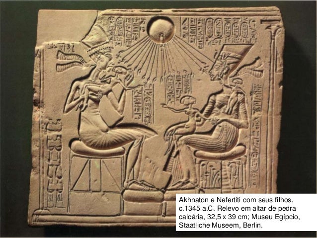 10. 10. Akhnaton e Nefertiti com seus filhos,c.1345 a.C. Relevo em altar de pedracalcária, 32,5 x 39 cm; Museu Egípcio,Staatliche Museem, Berlin.