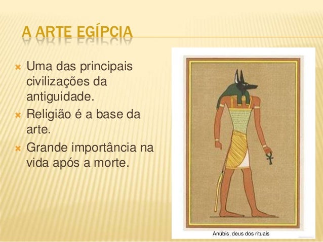 1. 1. A ARTE EGÍPCIA Uma das principais civilizações da antiguidade. Religião é a base da arte. Grande importância na vida após a morte. Anúbis, deus dos rituais