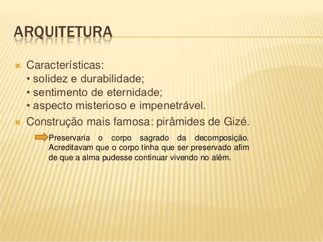 2. 2. ARQUITETURA Características: • solidez e durabilidade; • sentimento de eternidade; • aspecto misterioso e impenetrável. Construção mais famosa: pirâmides de Gizé. Preservaria o corpo sagrado da decomposição. Acreditavam que o corpo tinha que ser preservado afim de que a alma pudesse continuar vivendo no além.
