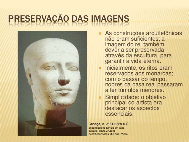 4. 4. PRESERVAÇÃO DAS IMAGENS  As construções arquitetônicas não eram suficientes; a imagem do rei também deveria ser preservada através da escultura, para garantir a vida eterna.  Inicialmente, os ritos eram reservados aos monarcas; com o passar do tempo, nobres da casa real passaram a ter túmulos menores.  Simplicidade: o objetivo principal do artista era destacar os aspectos essenciais. Cabeça, c. 2551-2528 a.C. Encontrado no túmulo em Gizé; calcario, altura 27,8cm; Kunsthistorisches Museum, Viena.