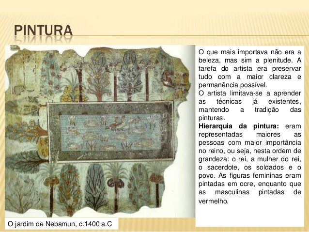 7. 7. PINTURA O que mais importava não era a beleza, mas sim a plenitude. A tarefa do artista era preservar tudo com a maior clareza e permanência possível. O artista limitava-se a aprender as técnicas já existentes, mantendo a tradição das pinturas. Hierarquia da pintura: eram representadas maiores as pessoas com maior importância no reino, ou seja, nesta ordem de grandeza: o rei, a mulher do rei, o sacerdote, os soldados e o povo. As figuras femininas eram pintadas em ocre, enquanto que as masculinas pintadas de vermelho.O jardim de Nebamun, c.1400 a.C
