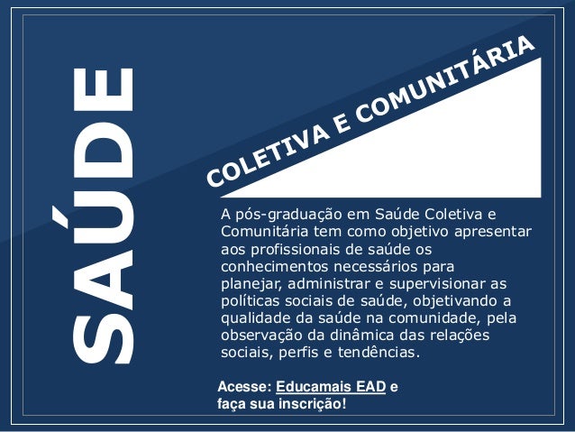 O curso Saúde Coletiva e Comunitária apresenta aos profissionais de saúde os conhecimentos necessários para planejar, administrar e supervisionar as políticas sociais de saúde, objetivando a qualidade da saúde na comunidade, pela observação da dinâmica das relações sociais, perfis e tendências.