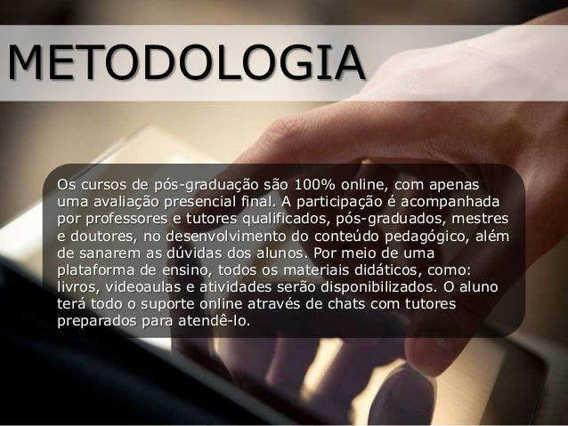 Os cursos de pós-graduação são 100% online, com apenas uma avaliação presencial final. A participação é acompanhada por professores e tutores qualificados, pós-graduados, mestres e doutores, no desenvolvimento do conteúdo pedagógico, além de sanarem as dúvidas dos alunos. Por meio de uma plataforma de ensino, todos os materiais didáticos, como: livros, videoaulas e atividades serão disponibilizados. O aluno terá todo o suporte online através de chats com tutores preparados para atendê-lo.