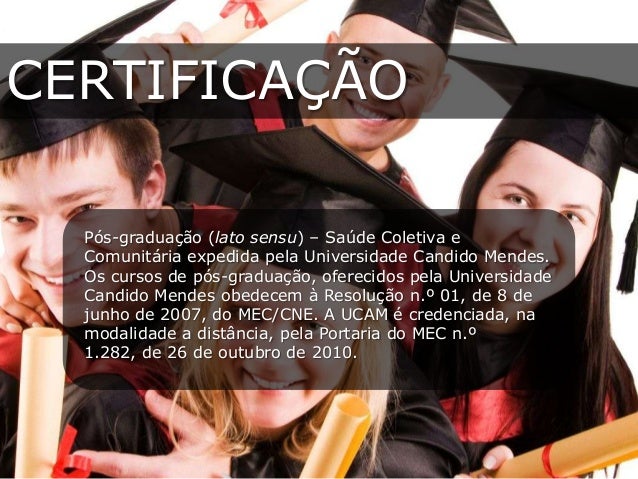 Os cursos de pós-graduação, oferecidos pela Universidade Candido Mendes na modalidade a distância, obedecem à Resolução n.º 01 de 8 de junho de 2.007, do MEC/CNE. A UCAM é credenciada, na modalidade a distância, pela Portaria do MEC n.º 1.282, de 26 de outubro de 2010.