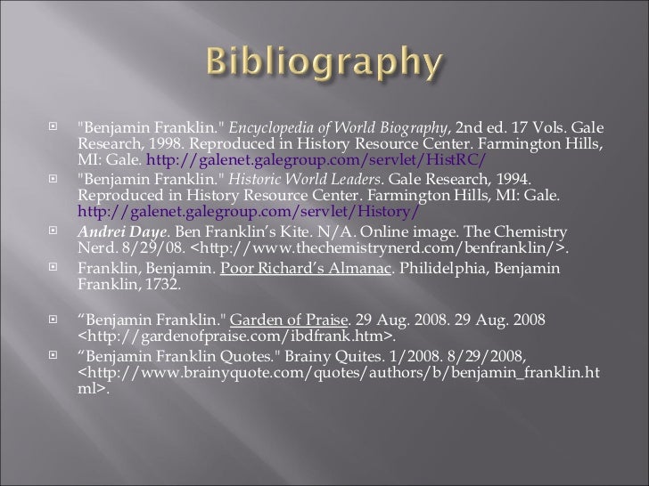 10. 10. <ul><li>&quot;Benjamin Franklin.&quot; Encyclopedia of World Biography , 2nd ed. 17 Vols. Gale Research, 1998. Reproduced in History Resource Center. Farmington Hills, MI: Gale. http://galenet.galegroup.com/servlet/HistRC/ </li></ul><ul><li>&quot;Benjamin Franklin.&quot; Historic World Leaders . Gale Research, 1994. Reproduced in History Resource Center. Farmington Hills, MI: Gale. http://galenet.galegroup.com/servlet/History/ </li></ul><ul><li>Andrei Daye . Ben Franklin’s Kite. N/A. Online image. The Chemistry Nerd. 8/29/08. <http://www.thechemistrynerd.com/benfranklin/>. </li></ul><ul><li>Franklin, Benjamin. Poor Richard’s Almanac . Philidelphia, Benjamin Franklin, 1732. </li></ul><ul><li>“ Benjamin Franklin.&quot; Garden of Praise . 29 Aug. 2008. 29 Aug. 2008 <http://gardenofpraise.com/ibdfrank.htm>. </li></ul><ul><li>“ Benjamin Franklin Quotes.&quot; Brainy Quites. 1/2008. 8/29/2008, <http://www.brainyquote.com/quotes/authors/b/benjamin_franklin.html>. </li></ul>