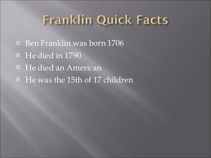 3. 3. <ul><li>Ben Franklin was born 1706 </li></ul><ul><li>He died in 1790 </li></ul><ul><li>He died an American </li></ul><ul><li>He was the 15th of 17 children </li></ul>