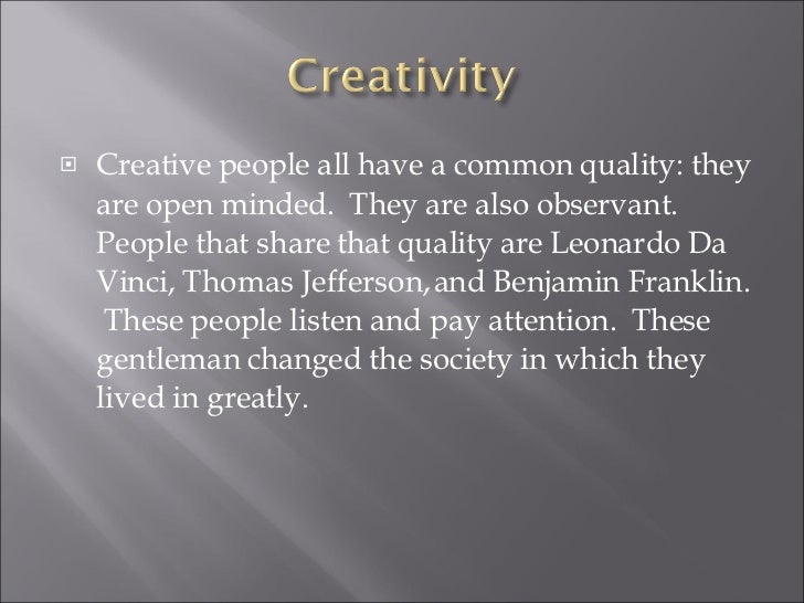 5. 5. <ul><li>Creative people all have a common quality: they are open minded. They are also observant. People that share that quality are Leonardo Da Vinci, Thomas Jefferson, and Benjamin Franklin. These people listen and pay attention. These gentleman changed the society in which they lived in greatly. </li></ul>
