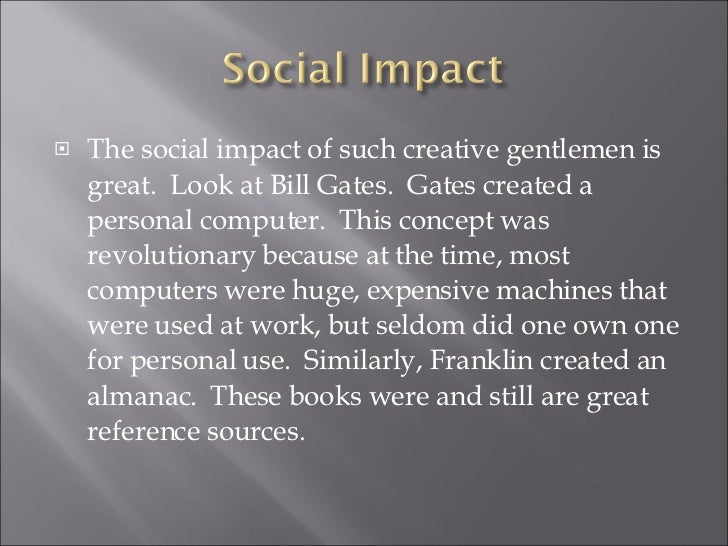 7. 7. <ul><li>The social impact of such creative gentlemen is great. Look at Bill Gates. Gates created a personal computer. This concept was revolutionary because at the time, most computers were huge, expensive machines that were used at work, but seldom did one own one for personal use. Similarly, Franklin created an almanac. These books were and still are great reference sources. </li></ul>