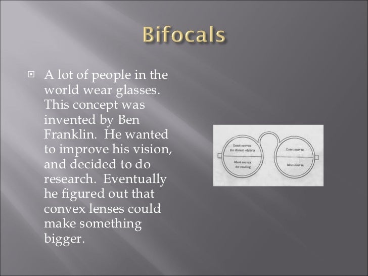 8. 8. <ul><li>A lot of people in the world wear glasses. This concept was invented by Ben Franklin. He wanted to improve his vision, and decided to do research. Eventually he figured out that convex lenses could make something bigger. </li></ul>