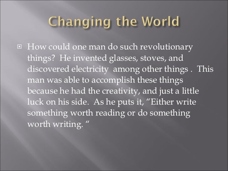 9. 9. <ul><li>How could one man do such revolutionary things? He invented glasses, stoves, and discovered electricity among other things . This man was able to accomplish these things because he had the creativity, and just a little luck on his side. As he puts it, “Either write something worth reading or do something worth writing. “ </li></ul>