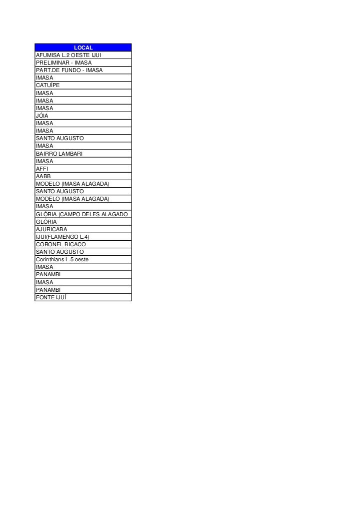 2. 2. LOCALAFUMISA L.2 OESTE IJUIPRELIMINAR - IMASAPART.DE FUNDO - IMASAIMASACATUÍPEIMASAIMASAIMASAJÓIAIMASAIMASASANTO AUGUSTOIMASABAIRRO LAMBARIIMASAAFFIAABBMODELO (IMASA ALAGADA)SANTO AUGUSTOMODELO (IMASA ALAGADA)IMASAGLÓRIA (CAMPO DELES ALAGADOGLÓRIAAJURICABAIJUI(FLAMENGO L.4)CORONEL BICACOSANTO AUGUSTOCorinthians L.5 oesteIMASAPANAMBIIMASAPANAMBIFONTE IJUÍ