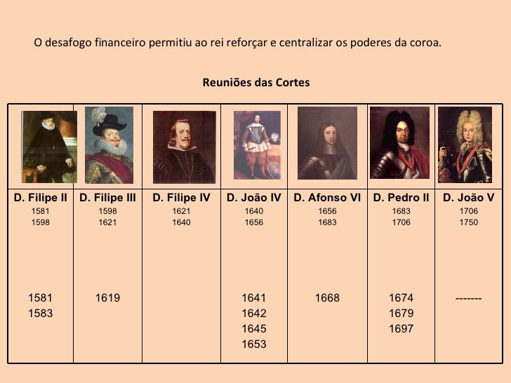 11. 11. Reuniões das Cortes O desafogo financeiro permitiu ao rei reforçar e centralizar os poderes da coroa. D. Filipe II 1581 1598 1581 1583 D. Filipe III 1598 1621 1619 D. Filipe IV 1621 1640 D. João IV 1640 1656 1641 1642 1645 1653 D. Afonso VI 1656 1683 1668 D. Pedro II 1683 1706 1674 1679 1697 D. João V 1706 1750 -------