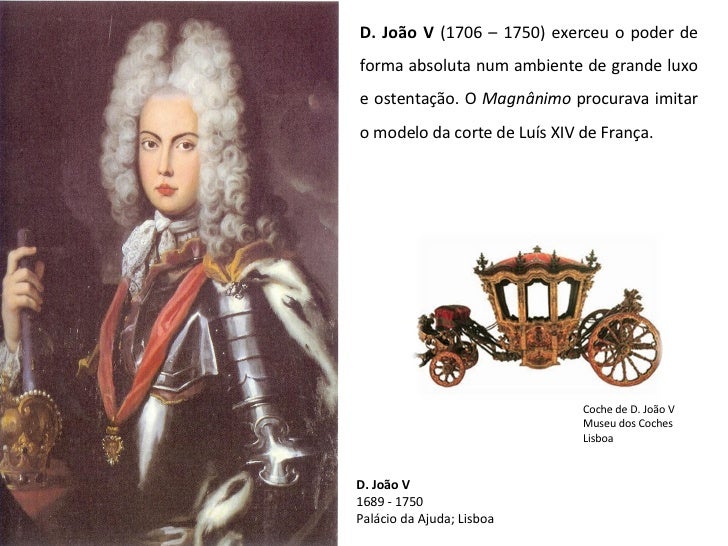 12. 12. D. João V 1689 - 1750 Palácio da Ajuda; Lisboa D. João V (1706 – 1750) exerceu o poder de forma absoluta num ambiente de grande luxo e ostentação. O Magnânimo procurava imitar o modelo da corte de Luís XIV de França. Coche de D. João V Museu dos Coches Lisboa