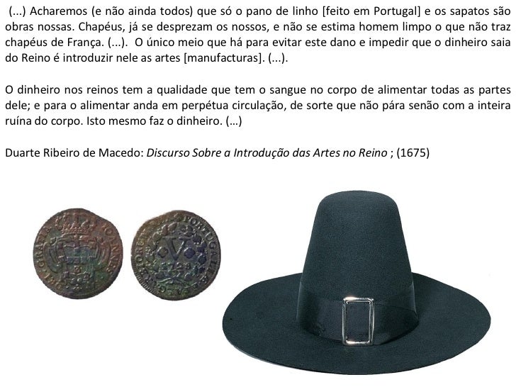 3. 3. (...) Acharemos (e não ainda todos) que só o pano de linho [feito em Portugal] e os sapatos são obras nossas. Chapéus, já se desprezam os nossos, e não se estima homem limpo o que não traz chapéus de França. (...). O único meio que há para evitar este dano e impedir que o dinheiro saia do Reino é introduzir nele as artes [manufacturas]. (...). O dinheiro nos reinos tem a qualidade que tem o sangue no corpo de alimentar todas as partes dele; e para o alimentar anda em perpétua circulação, de sorte que não pára senão com a inteira ruína do corpo. Isto mesmo faz o dinheiro. (…) Duarte Ribeiro de Macedo: Discurso Sobre a Introdução das Artes no Reino ; (1675)