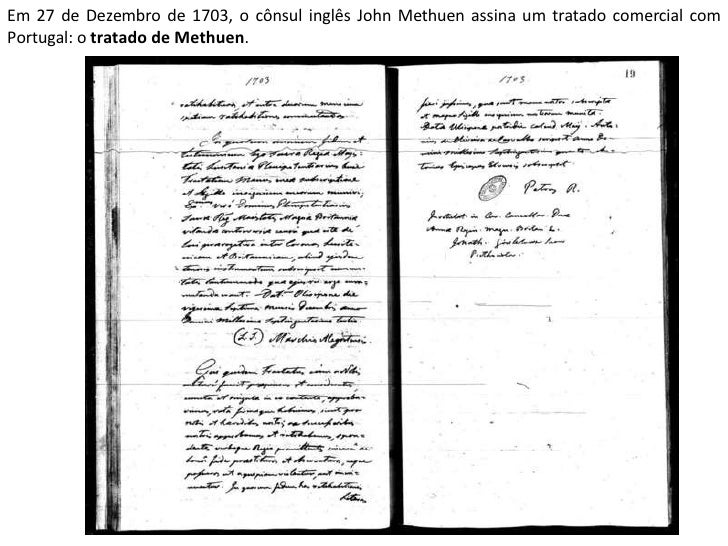 6. 6. Em 27 de Dezembro de 1703, o cônsul inglês John Methuen assina um tratado comercial com Portugal: o tratado de Methuen .