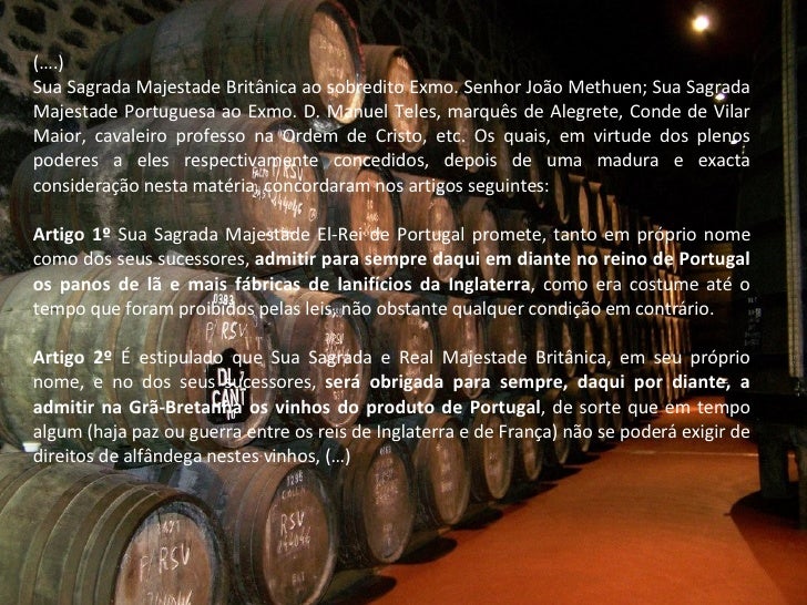 7. 7. (….) Sua Sagrada Majestade Britânica ao sobredito Exmo. Senhor João Methuen; Sua Sagrada Majestade Portuguesa ao Exmo. D. Manuel Teles, marquês de Alegrete, Conde de Vilar Maior, cavaleiro professo na Ordem de Cristo, etc. Os quais, em virtude dos plenos poderes a eles respectivamente concedidos, depois de uma madura e exacta consideração nesta matéria, concordaram nos artigos seguintes: Artigo 1º Sua Sagrada Majestade El-Rei de Portugal promete, tanto em próprio nome como dos seus sucessores, admitir para sempre daqui em diante no reino de Portugal os panos de lã e mais fábricas de lanifícios da Inglaterra , como era costume até o tempo que foram proibidos pelas leis, não obstante qualquer condição em contrário. Artigo 2º É estipulado que Sua Sagrada e Real Majestade Britânica, em seu próprio nome, e no dos seus sucessores, será obrigada para sempre, daqui por diante, a admitir na Grã-Bretanha os vinhos do produto de Portugal , de sorte que em tempo algum (haja paz ou guerra entre os reis de Inglaterra e de França) não se poderá exigir de direitos de alfândega nestes vinhos, (…)