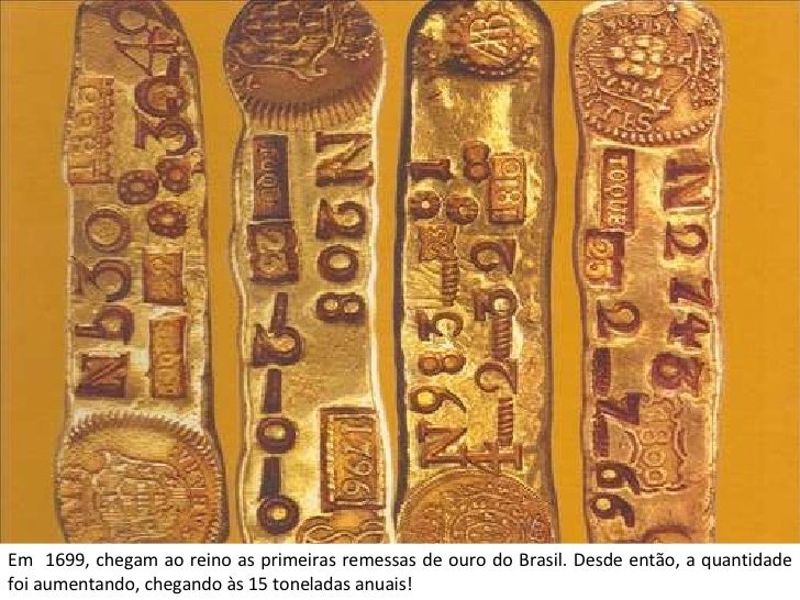 8. 8. Em 1699, chegam ao reino as primeiras remessas de ouro do Brasil. Desde então, a quantidade foi aumentando, chegando às 15 toneladas anuais!