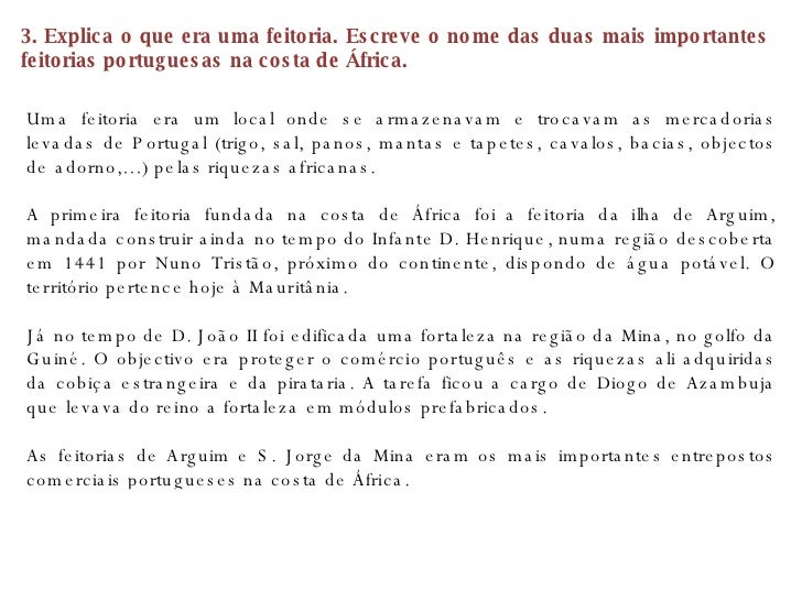 10. 10. 3. Explica o que era uma feitoria. Escreve o nome das duas mais importantes feitorias portuguesas na costa de África. Uma feitoria era um local onde se armazenavam e trocavam as mercadorias levadas de Portugal (trigo, sal, panos, mantas e tapetes, cavalos, bacias, objectos de adorno,…) pelas riquezas africanas. A primeira feitoria fundada na costa de África foi a feitoria da ilha de Arguim, mandada construir ainda no tempo do Infante D. Henrique, numa região descoberta em 1441 por Nuno Tristão, próximo do continente, dispondo de água potável. O território pertence hoje à Mauritânia. Já no tempo de D. João II foi edificada uma fortaleza na região da Mina, no golfo da Guiné. O objectivo era proteger o comércio português e as riquezas ali adquiridas da cobiça estrangeira e da pirataria. A tarefa ficou a cargo de Diogo de Azambuja que levava do reino a fortaleza em módulos prefabricados. As feitorias de Arguim e S. Jorge da Mina eram os mais importantes entrepostos comerciais portugueses na costa de África.