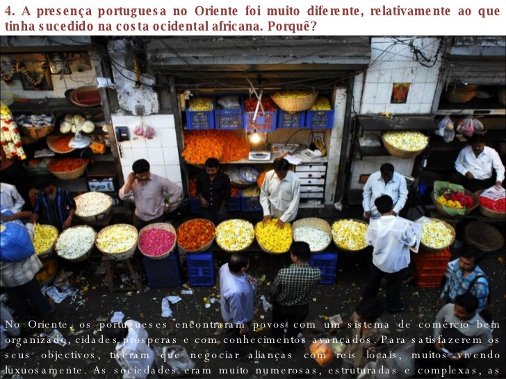 11. 11. 4. A presença portuguesa no Oriente foi muito diferente, relativamente ao que tinha sucedido na costa ocidental africana. Porquê? No Oriente, os portugueses encontraram povos com um sistema de comércio bem organizado, cidades prósperas e com conhecimentos avançados. Para satisfazerem os seus objectivos, tiveram que negociar alianças com reis locais, muitos vivendo luxuosamente. As sociedades eram muito numerosas, estruturadas e complexas, as línguas eram desconhecidas.