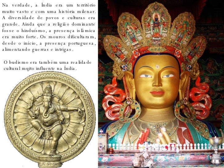 13. 13. Na verdade, a Índia era um território muito vasto e com uma história milenar. A diversidade de povos e culturas era grande. Ainda que a religião dominante fosse o hinduísmo, a presença islâmica era muito forte. Os mouros dificultaram, desde o início, a presença portuguesa, alimentando guerras e intrigas. O budismo era também uma realidade cultural muito influente na Índia.