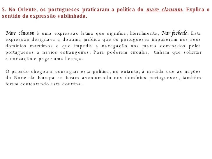 14. 14. 5. No Oriente, os portugueses praticaram a política do mare clausum . Explica o sentido da expressão sublinhada. Mare clausum é uma expressão latina que significa, literalmente, Mar fechado . Esta expressão designava a doutrina jurídica que os portugueses impuseram nos seus domínios marítimos e que impedia a navegação nos mares dominados pelos portugueses a navios estrangeiros. Para poderem circular, tinham que solicitar autorização e pagar uma licença. O papado chegou a consagrar esta política, no entanto, à medida que as nações do Norte da Europa se foram aventurando nos domínios portugueses, também foram contestando esta doutrina.
