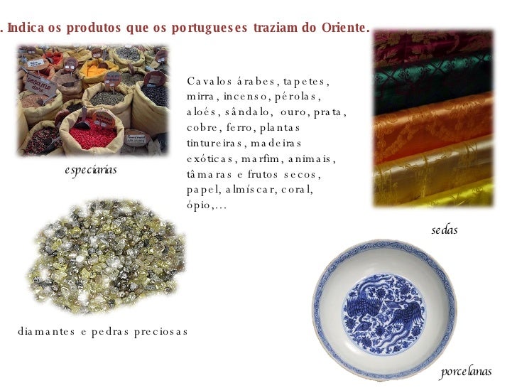 15. 15. 6. Indica os produtos que os portugueses traziam do Oriente. especiarias sedas diamantes e pedras preciosas porcelanas Cavalos árabes, tapetes, mirra, incenso, pérolas, aloés, sândalo, ouro, prata, cobre, ferro, plantas tintureiras, madeiras exóticas, marfim, animais, tâmaras e frutos secos, papel, almíscar, coral, ópio,…