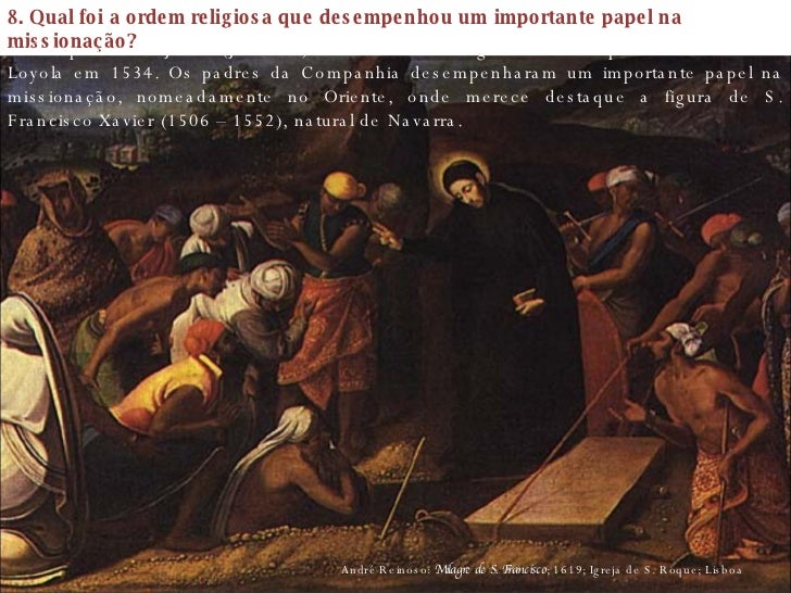 17. 17. André Reinoso: Milagre de S. Francisco ; 1619; Igreja de S. Roque; Lisboa 8. Qual foi a ordem religiosa que desempenhou um importante papel na missionação? A Companhia de Jesus (Jesuítas) foi uma ordem religiosa fundada por Santo Inácio de Loyola em 1534. Os padres da Companhia desempenharam um importante papel na missionação, nomeadamente no Oriente, onde merece destaque a figura de S. Francisco Xavier (1506 – 1552), natural de Navarra.