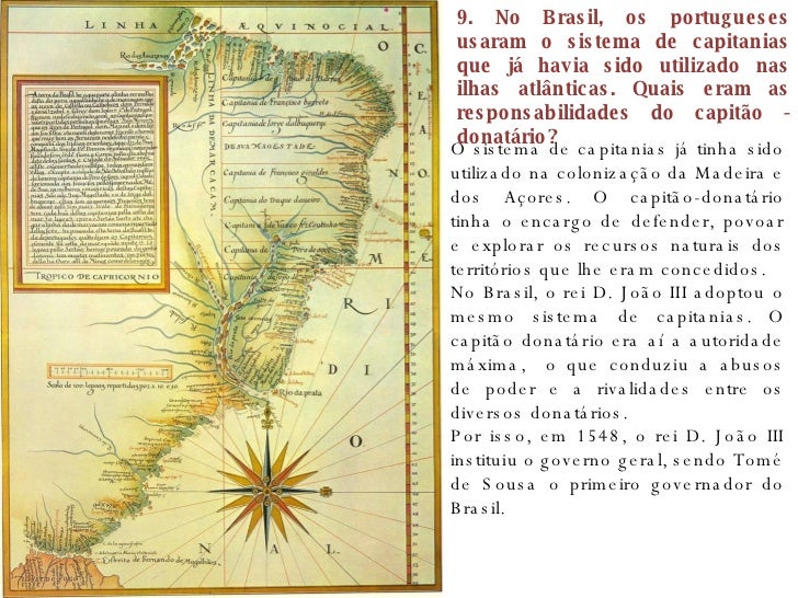 18. 18. 9. No Brasil, os portugueses usaram o sistema de capitanias que já havia sido utilizado nas ilhas atlânticas. Quais eram as responsabilidades do capitão - donatário? O sistema de capitanias já tinha sido utilizado na colonização da Madeira e dos Açores. O capitão-donatário tinha o encargo de defender, povoar e explorar os recursos naturais dos territórios que lhe eram concedidos. No Brasil, o rei D. João III adoptou o mesmo sistema de capitanias. O capitão donatário era aí a autoridade máxima, o que conduziu a abusos de poder e a rivalidades entre os diversos donatários. Por isso, em 1548, o rei D. João III instituiu o governo geral, sendo Tomé de Sousa o primeiro governador do Brasil.