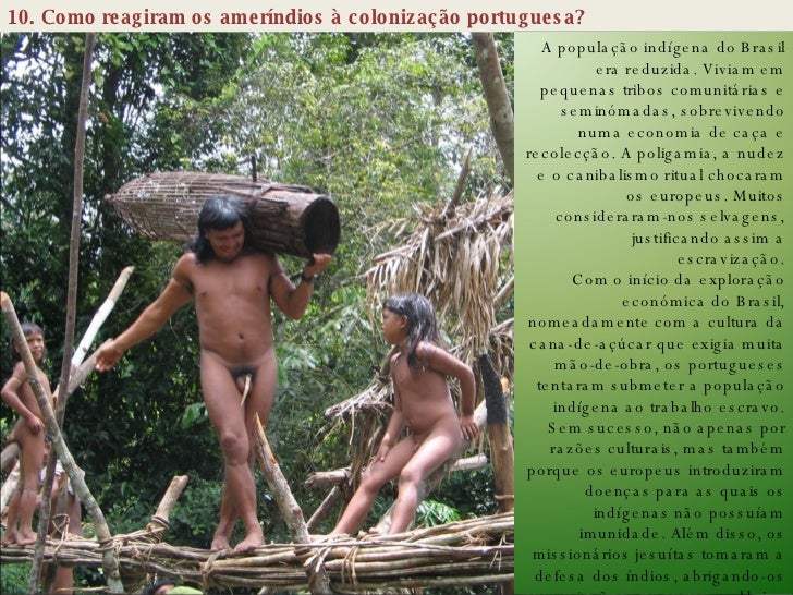 19. 19. 10. Como reagiram os ameríndios à colonização portuguesa? A população indígena do Brasil era reduzida. Viviam em pequenas tribos comunitárias e seminómadas, sobrevivendo numa economia de caça e recolecção. A poligamia, a nudez e o canibalismo ritual chocaram os europeus. Muitos consideraram-nos selvagens, justificando assim a escravização. Com o início da exploração económica do Brasil, nomeadamente com a cultura da cana-de-açúcar que exigia muita mão-de-obra, os portugueses tentaram submeter a população indígena ao trabalho escravo. Sem sucesso, não apenas por razões culturais, mas também porque os europeus introduziram doenças para as quais os indígenas não possuíam imunidade. Além disso, os missionários jesuítas tomaram a defesa dos índios, abrigando-os em missões e pequenas aldeias no interior do território amazónico.