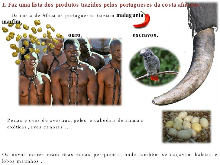 2. 2. 1. Faz uma lista dos produtos trazidos pelos portugueses da costa africana. Da costa de África os portugueses traziam malagueta , marfim , ouro , escravos. Os novos mares eram ricas zonas pesqueiras, onde também se caçavam baleias e lobos marinhos . Penas e ovos de avestruz, peles e cabedais de animais exóticos, aves canoras…