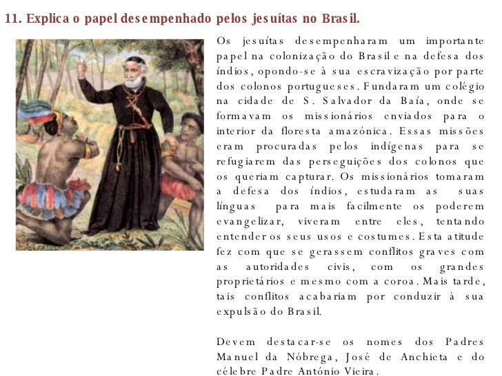 20. 20. 11. Explica o papel desempenhado pelos jesuítas no Brasil. Os jesuítas desempenharam um importante papel na colonização do Brasil e na defesa dos índios, opondo-se à sua escravização por parte dos colonos portugueses. Fundaram um colégio na cidade de S. Salvador da Baía, onde se formavam os missionários enviados para o interior da floresta amazónica. Essas missões eram procuradas pelos indígenas para se refugiarem das perseguições dos colonos que os queriam capturar. Os missionários tomaram a defesa dos índios, estudaram as suas línguas para mais facilmente os poderem evangelizar, viveram entre eles, tentando entender os seus usos e costumes. Esta atitude fez com que se gerassem conflitos graves com as autoridades civis, com os grandes proprietários e mesmo com a coroa. Mais tarde, tais conflitos acabariam por conduzir à sua expulsão do Brasil. Devem destacar-se os nomes dos Padres Manuel da Nóbrega, José de Anchieta e do célebre Padre António Vieira.