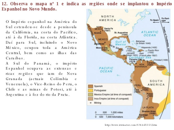 21. 21. 12. Observa o mapa nº 1 e indica as regiões onde se implantou o Império Espanhol no Novo Mundo. http://www.irwinator.com/126/sd5555.htm O Império espanhol na América do Sul estendeu-se desde a península da Califórnia, na costa do Pacífico, até à da Florida, na costa Atlântica. Daí para Sul, incluindo o Novo México, ocupou toda a América Central, bem como as ilhas das Caraíbas. A Sul do Panamá, o império Espanhol ocupava as extensas e ricas regiões que iam de Nova Granada (actuais Colômbia e Venezuela), o Vice-Reino do Peru, o Chile e as minas de Potosi, até à Argentina e à foz do rio da Prata.