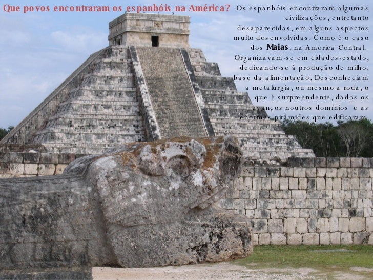 22. 22. 13. Que povos encontraram os espanhóis na América? Os espanhóis encontraram algumas civilizações, entretanto desaparecidas, em alguns aspectos muito desenvolvidas. Como é o caso dos Maias , na América Central. Organizavam-se em cidades-estado, dedicando-se à produção de milho, base da alimentação. Desconheciam a metalurgia, ou mesmo a roda, o que é surpreendente, dados os avanços noutros domínios e as enormes pirâmides que edificaram.