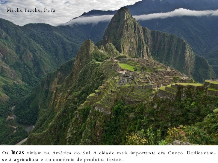 24. 24. Machu Picchu; Peru Os Incas viviam na América do Sul. A cidade mais importante era Cuzco. Dedicavam-se à agricultura e ao comércio de produtos têxteis.