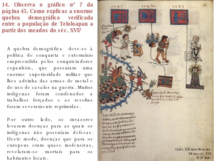 25. 25. 14. Observa o gráfico nº 7 da página 45. Como explicas a enorme quebra demográfica verificada entre a população de Teloloapan a partir dos meados do séc. XVI? A quebra demográfica deve-se à política de conquista e extermínio empreendida pelos conquistadores espanhóis, que possuíam uma enorme superioridade militar que lhes advinha das armas de metal e do uso de cavalos na guerra. Muitos indígenas foram condenados a trabalhos forçados e as revoltas foram severamente reprimidas. Por outro lado, os invasores levaram doenças para as quais os indígenas não possuíam defesas. Deste modo, doenças que para os europeus eram quase inofensivas, revelaram-se mortais para os habitantes locais. Codex Telleriano-Remensis Mexico; séc. XVI B. N. Paris