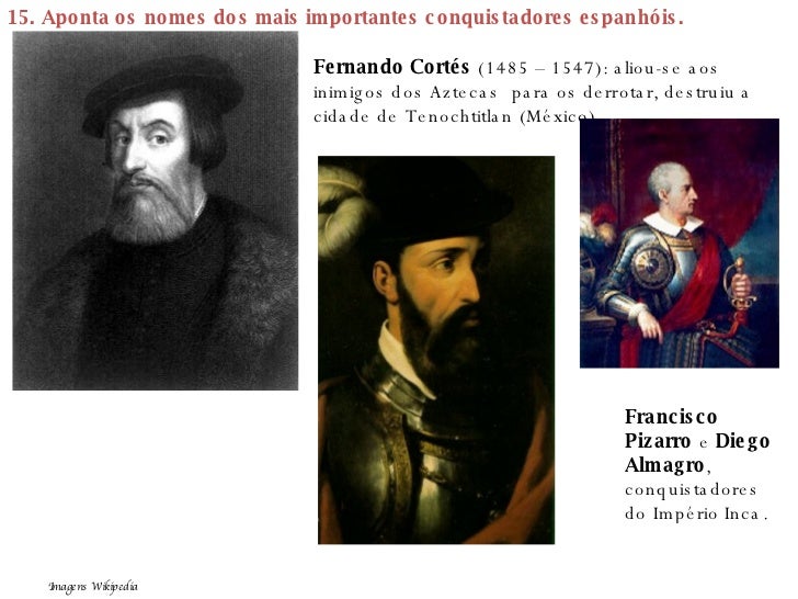 26. 26. 15. Aponta os nomes dos mais importantes conquistadores espanhóis. Fernando Cortés (1485 – 1547): aliou-se aos inimigos dos Aztecas para os derrotar, destruiu a cidade de Tenochtitlan (México) Francisco Pizarro e Diego Almagro , conquistadores do Império Inca. Imagens Wikipedia